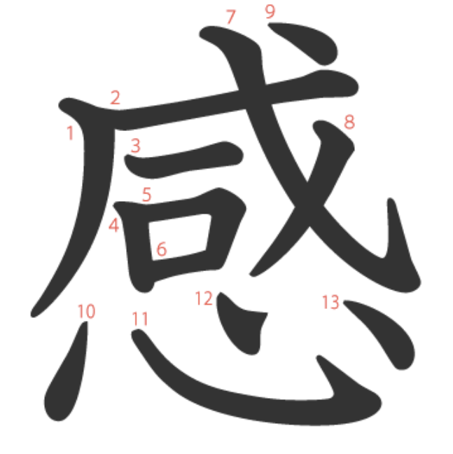 - カン 感じ 느낌/감각/인상, 感情 감정, 直感 직감, 感想 감상, 感激 감격
