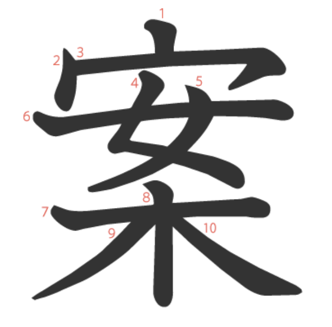 案는 "나무 책상(木) 앞에 앉아서(安) 생각하다" -> "제안, 계획, 생각"이라는 뜻의 글자입니다.