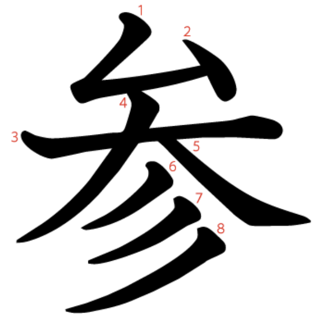 参 = ム + 大 + 彡。
