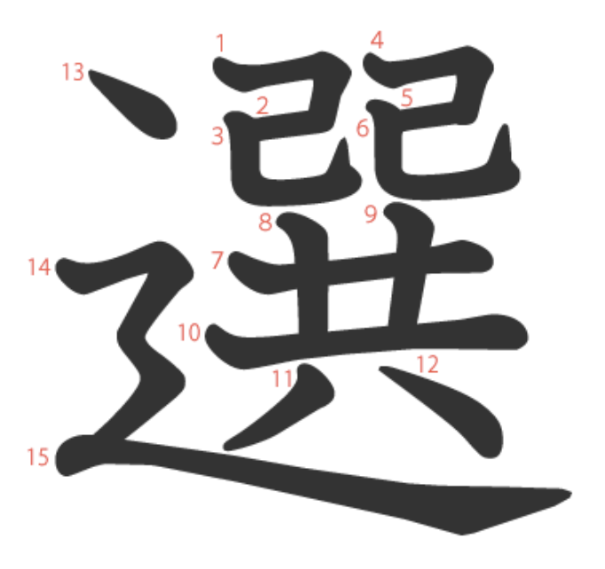 選 = ⻌ + 己 + 己 + 共。