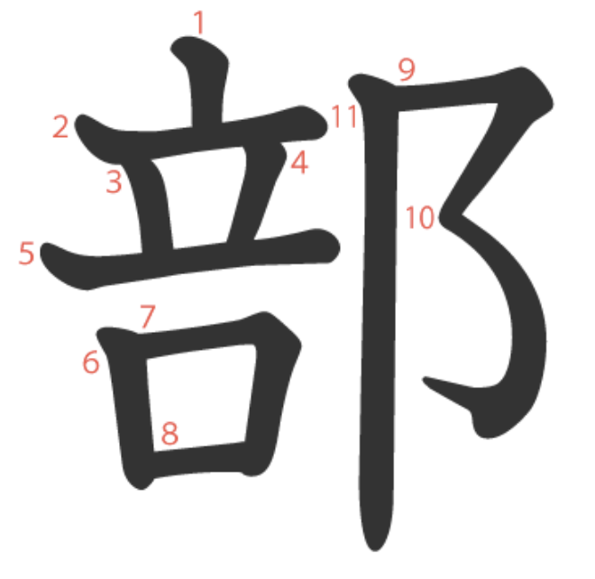 - ブ 部分 부분, 全部 전부, 部門 부문, 部長 부장