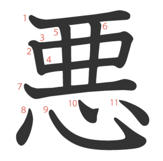 - 의미 "악할 악/미워할 오". 악, 나쁘다, 미워하다
