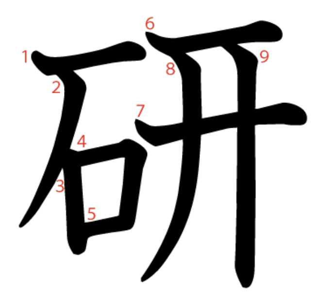 研 = 石 + 开。