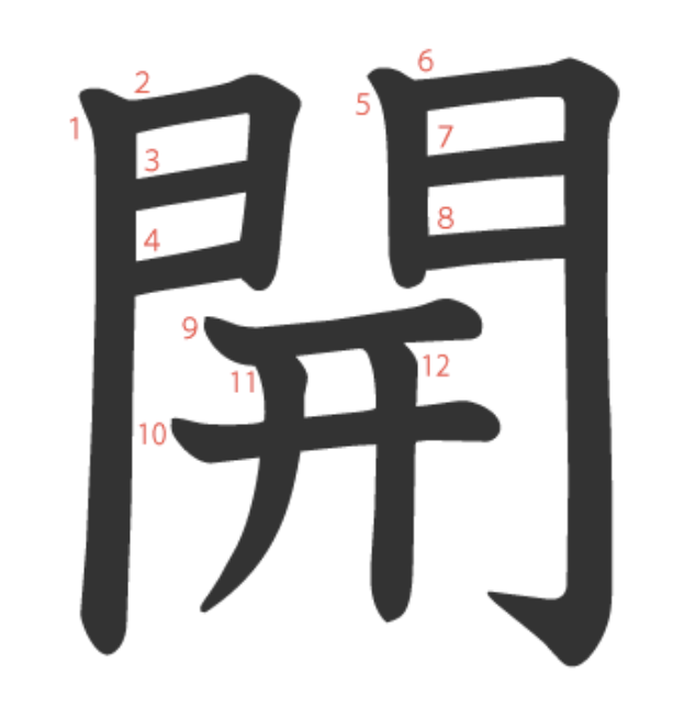 - 훈독 ひら(く)、ひら(ける)、あ(く)、あ(ける)