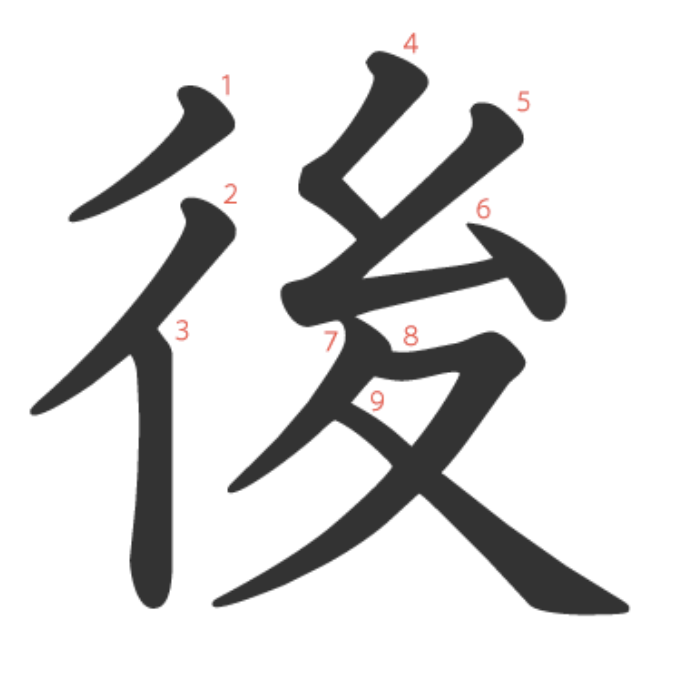 - 훈독 あと、のち、うし(ろ)、おく(れる)