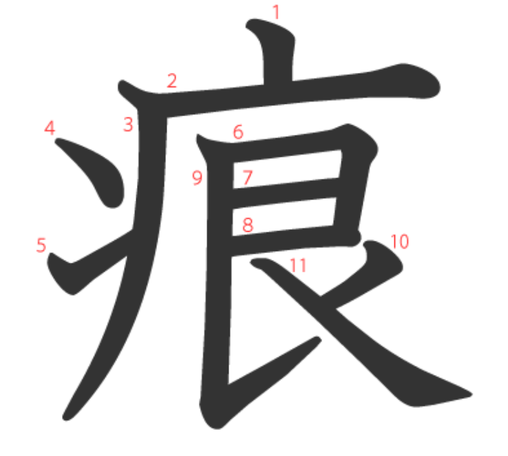 痕는 "천민(艮)의 등에 난 채찍 자국(疒)" -> "흔적, 자국, 흉터"라는 뜻의 글자입니다.