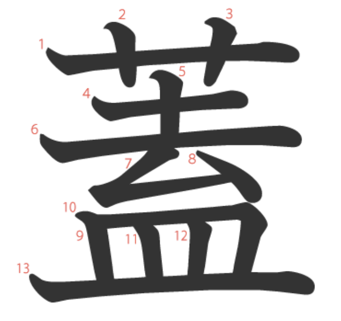 蓋 = 艹 + 土 + 厶 + 皿。