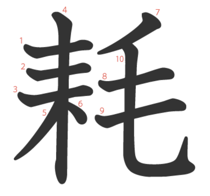 (소리부 겸 의미부) 「毛」(モウ)는 여기서는 "쟁기(耒)의 이가 나가고 휘어진 모습"을 그린 모양자로 쓰인 것입니다.