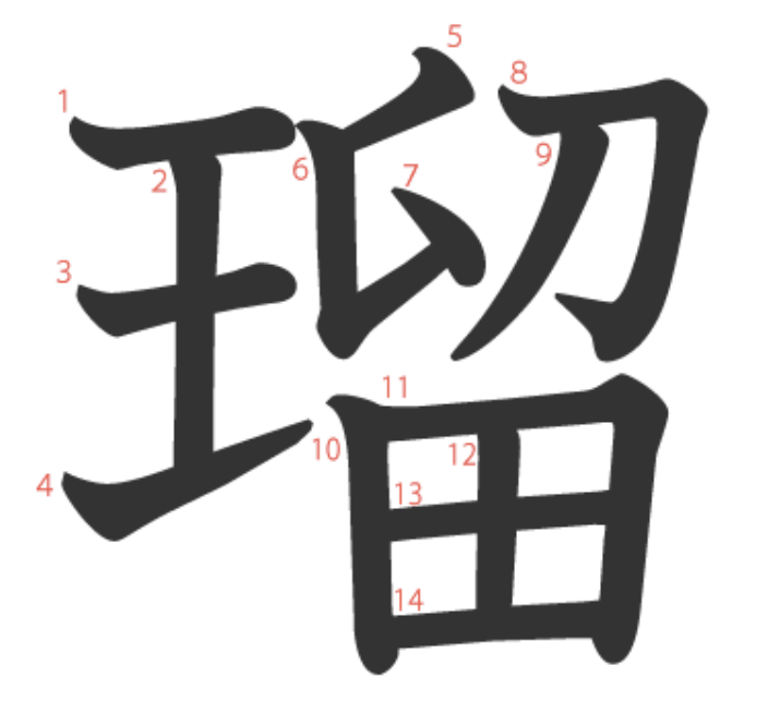 瑠는 "투명한 유리구슬(𤣩)" -> "유리"라는 뜻의 글자입니다(留는 소리부).