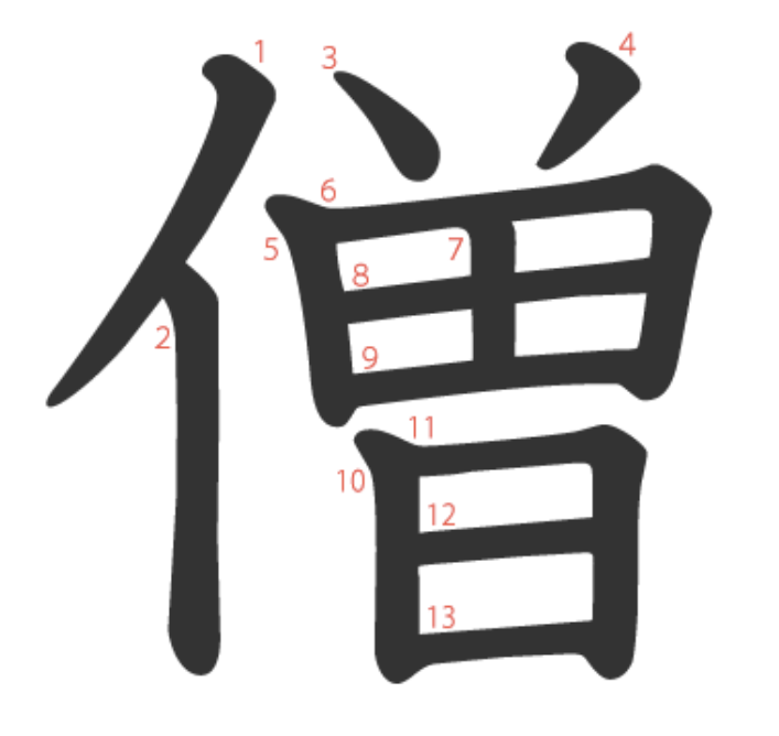 僧는 "절에서 수행을 쌓는(曽) 사람(亻)" -> "승려"라는 뜻의 글자입니다.