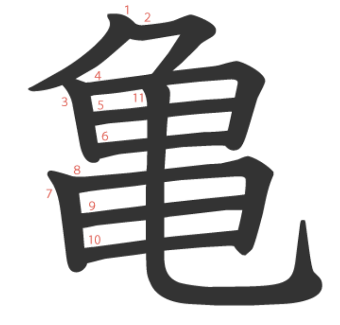 亀는 "거대한 바다거북의 머리와 등딱지, 꼬리"를 그린 상형문자입니다.